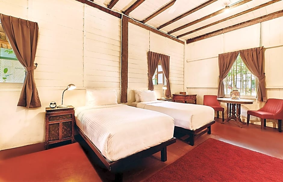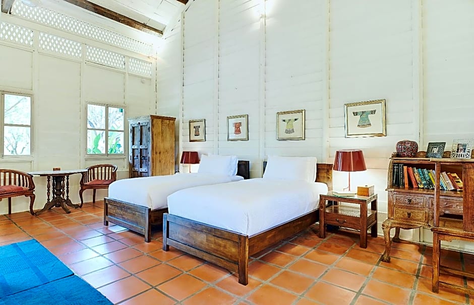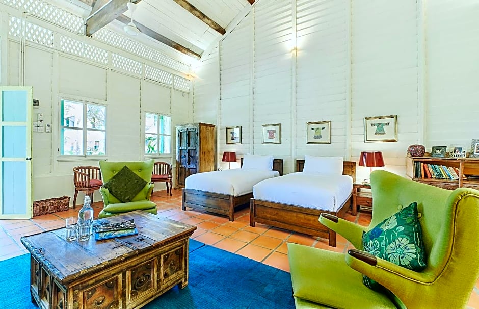 It features 2 bedrooms, with a king bed in one room and two single beds in another room. It has a bathroom with shower only, located upstairs in the Plantation House.